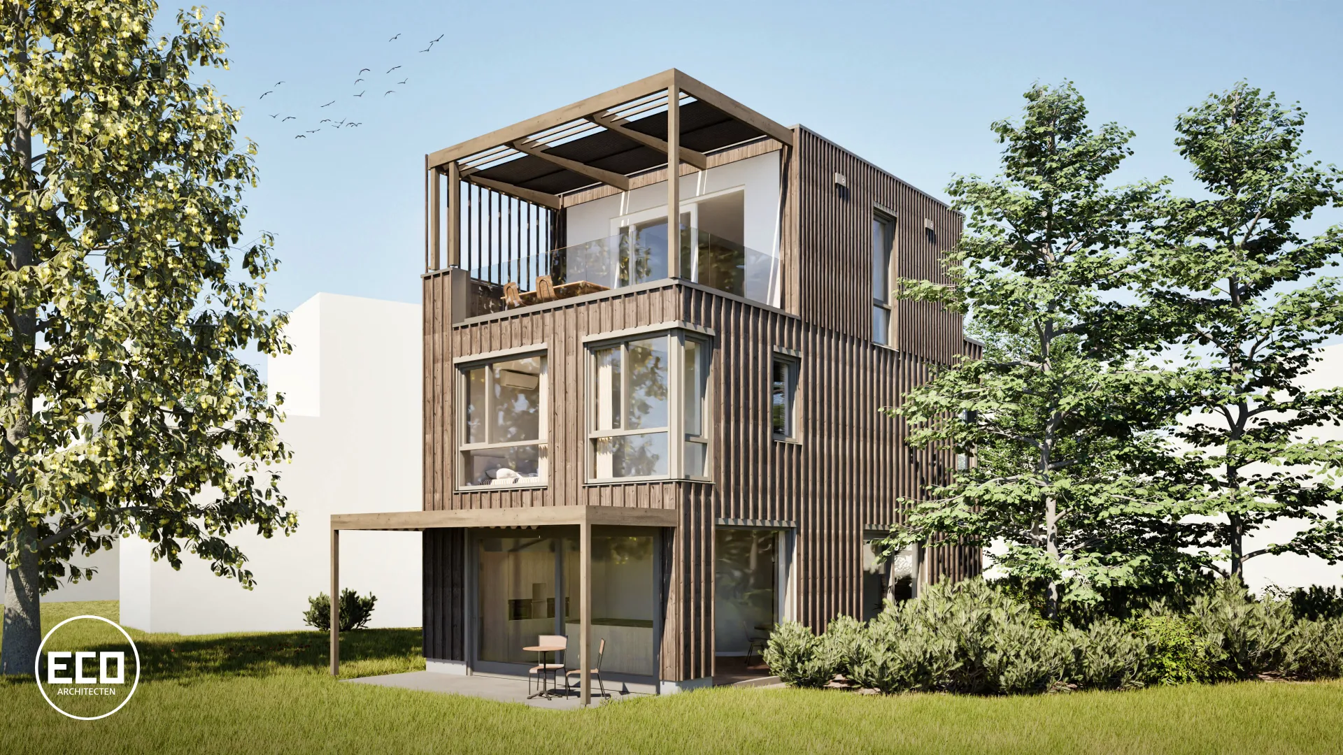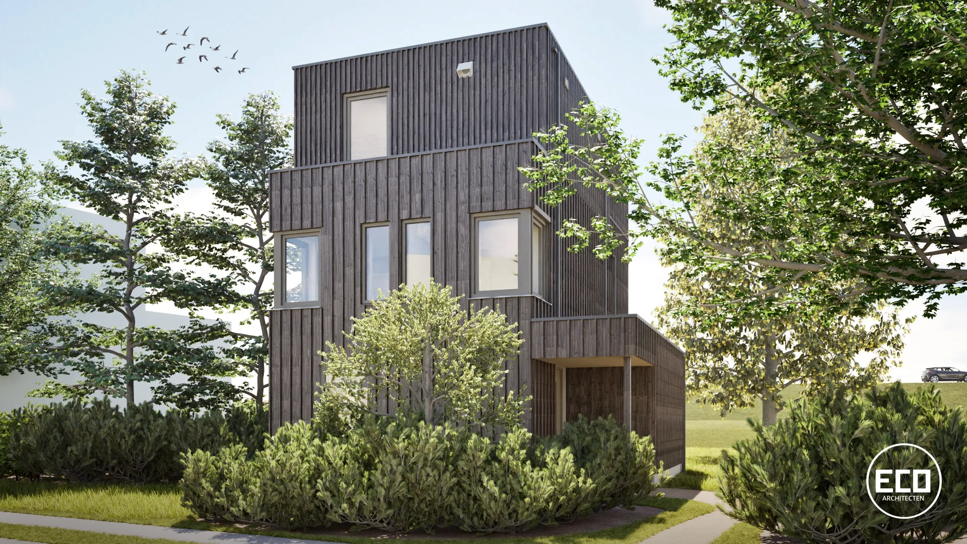 In het gevelontwerp is creatief gespeeld met de mogelijkheden van de locatie. Door de toepassing van speelse gevelopeningen krijgt elke gevel en binnenruimte een eigen karakter. De dieptewerking van de gevel wordt versterkt door de toepassing van dikkere gevelplanken, die een subtiel 3D-effect creëren en de gevelopeningen visueel met elkaar verbinden.